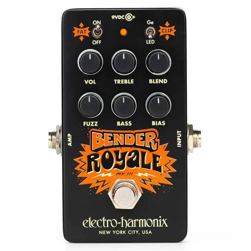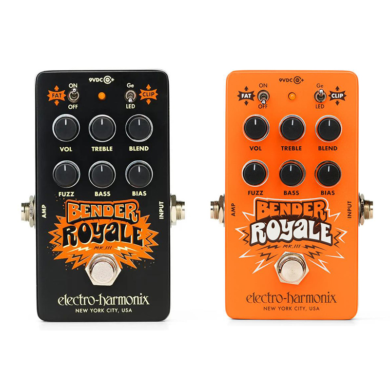 3トランジスタ・ファズの歴史は、多くのメーカーと個性豊かなバリエーションによって築かれてきました。Bender Royale Fuzz は、その系譜に新たな1ページを刻むべく誕生した、EHX渾身のファズペダルです。ヴィンテージのゲルマニウム回路をベースにした MKIII バージョン を採用し、オリジナルの濃厚なキャラクターを継承。分厚くスムーズなファズから荒々しいスパッタリングまで幅広いサウンドメイクが可能です。荒々しく攻撃的なファズが欲しい人も、力強く深みのあるトーンを求める人も、Bender Royale が応えます。オリジナルの3ノブ構成は VOL、FUZZ、BASS として搭載され、出力、ゲイン、低域レスポンスを自在にコントロール。巨大なリズムトーンから鋭いリードまで幅広く対応します。現代的なアップグレードの中心は、低音とロー・ミッドをブーストする FATスイッチ。CLIPスイッチ は最終段トランジスタのクリッピング構造を切り替え、GeからLEDに変更することで荒々しいエッジの効いたトーンを実現。BIASコントロール は回路電圧を調整し、スムーズからスパッタリングまで自在に変化。TREBLE は高域をコントロールし、BLEND でクリーン信号をミックスすれば、アタック感や明瞭さを保ちながら他ペダルやベース使用にも対応します。