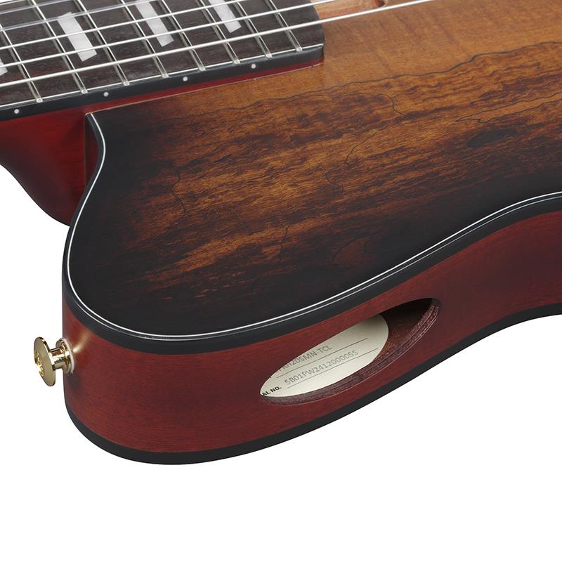 個性的な杢目のスポルテッド・メイプル材トップです。ボディはウッディなロウ・グロス仕上げです。(ヘッド表面もスポルテッド・メイプル材貼り)