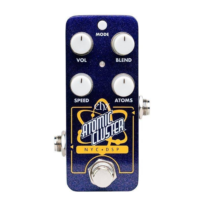 Atomic Cluster Spectral Decomposerは、シンセのようなサウンドや空間的な雰囲気を生み出す、Electro-Harmonix初のグリッチ&シンセ系ペダルです。Atomic Cluster Spectral Decomposerは、あなたのトーンを原子レベルまで分解する、Electro-Harmonixがこれまでに製作してきたどのエフェクトとも異なる新しいタイプのコンパクトなグリッチ&シンセ・ペダルです。入力信号を分解し、独自のアルゴリズムによって再構築することで、音楽的で遊び心のある多彩なサウンドを生み出します。このアルゴリズムは楽器の周波数解像度を意図的に下げることで、入力信号に基づいた共鳴オシレーションを生成し、リズミカルなローファイ・グリッチやオートアルペジオ風トーン、アンビエントなシンセパッドなど、幅広いユニークなエフェクトを実現します。Atomic ClusterのメインコントロールはATOMSノブとSPEEDノブの2つです。ATOMSは、同時に発生する共鳴オシレーションの数を調整し、処理される信号の全帯域から単音までをコントロールします。オシレーションの数を増やすと入力信号に近い自然な トーンとなり、数を減らすとオシレーションが少なくなり、ピクセル化されたようなグリッチ サウンドになります。SPEEDノブはオシレーションが更新される速さを調整し、エフェクトのタイミングやリズムをコントロールします。遅い設定ではステップフィルターのようなリズミカルな効果を、速い設定ではランダムで混沌とした印象の効果を作り出すことができます。SPEEDはタップテンポでも設定可能です。さらに、VOLとBLENDコントロールにより、出力レベルとウェット/ドライのミックスバランスをそれぞれ調整することができます。MODEボタンは、オシレーションの変化特性を選択するSHARPモードとSMOOTHモードを切り替えます。SHARPモードではオシレーションが瞬時に切り替わり、より即時的でリズミカルな効果を生み出します。一方、SMOOTHモードではオシレーション同士が滑らかに重なり合うように変化し、より豊かでアンビエントなサウンドを作り出します。