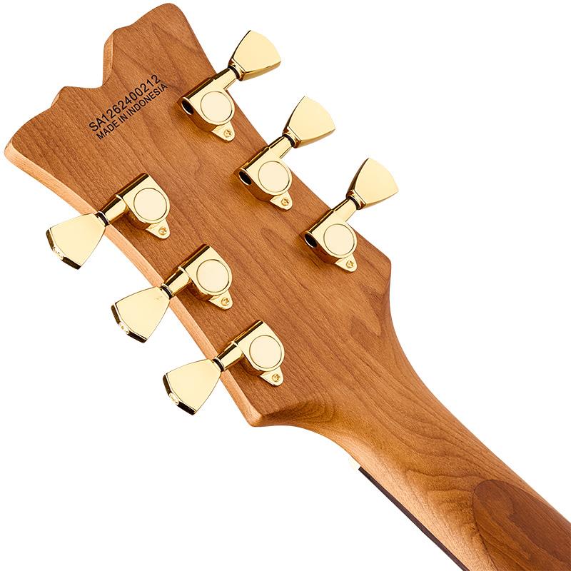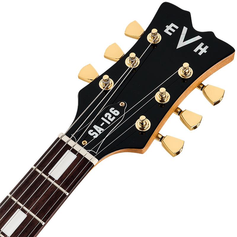 SA-126 Standardは、マホガニーボディにチェンバー加工を施し、剛性と卓越したトーンを得るためにマホガニーセンターブロックを追加しています。メイプルトップとナチュラルボディバインディングは、クラシックでクリーンなルックスをエンハンスします。メイクドメイプルネックには、グラファイト補強ロッドを内蔵し、22本のジャンボフレットと新たなブロックインレイデザインを採用した12~16インチコンパウンドラジアス仕様のローズウッド指板を装備しています。24.75インチスケールで、快適かつ親しみやすいモダンクラシックのようなフィールが得られます。ネックエンドにはスポークホイールを装備し、トラスロッド調整が簡単に行えます。