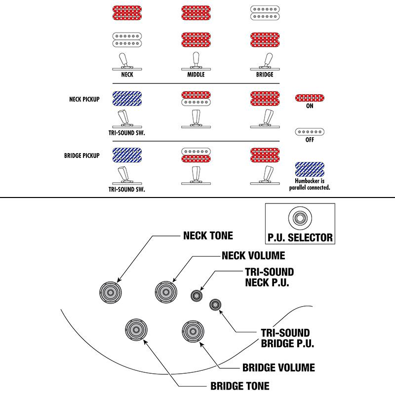また、トライ・サウンド・スイッチと呼ぶミニ・スイッチを2つ備え、ネック側とブリッジ側ピックアップそれぞれを「シリーズ⇔コイルタップ⇔パラレル」配線で使い分けることが可能です