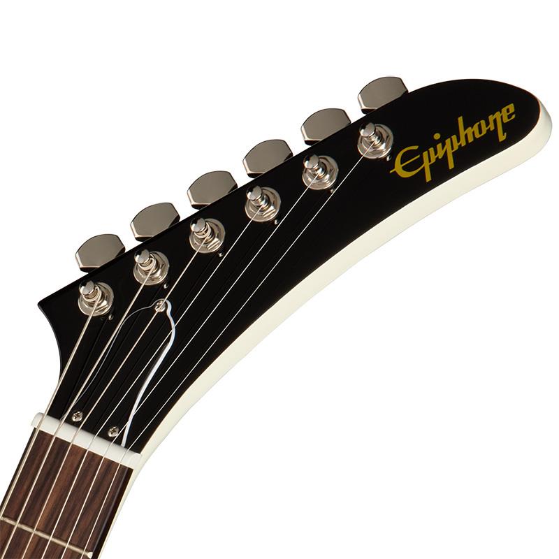 やや短めの70年代仕様アローヘッド・シェイプのヘッドストックには、スペード・ボタン付きGrover RotomaticチューナーとGraph Techナットを装備し、安定したチューニング性能を実現しています。弦はEpiphone LockTone Tune-O-Maticブリッジを通り、LockToneストップ・バー・テイルピースに固定されます。