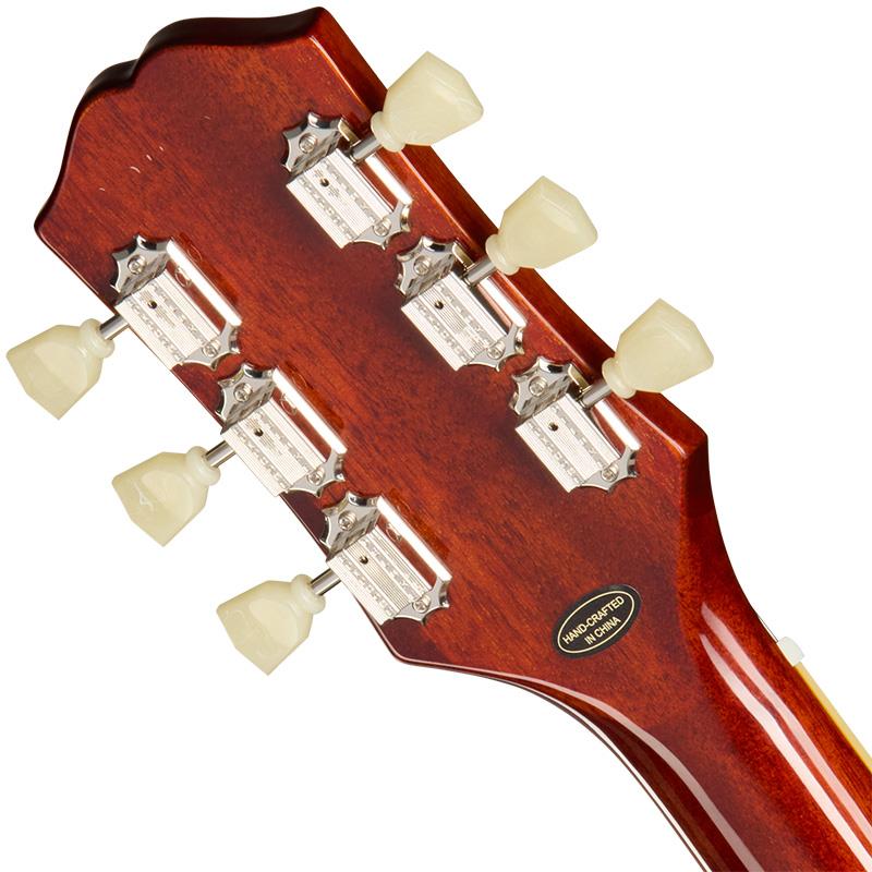 指板にはローズウッドを採用し、パーロイド・トラペゾイド・インレイと22本のミディアム・ジャンボ・フレットを備えています。60sスタイルのカラマズー・ヘッドストックには、Grover RotomaticチューナーとGraph Techナットを搭載し、安定したチューニング性能を実現しています。ブリッジにはエピフォンLockTone Tune-O-Matic、テイルピースにはLockToneストップ・バー・テイルピースを採用しています。