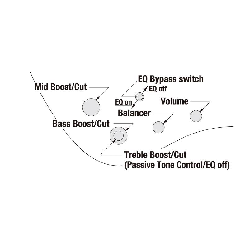 High/Mid/Low 3バンドのイコライジングが可能なアクティブEQです。パッシブ・モード時はHighノブがトーン・コントロールとして機能します。