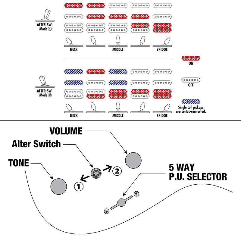 ミニスイッチの切り替えひとつで、自在にハムバッカー・モードとシングルコイル・モードへ切り替えられ、9パターンのサウンド・バリエーションを奏でられます。