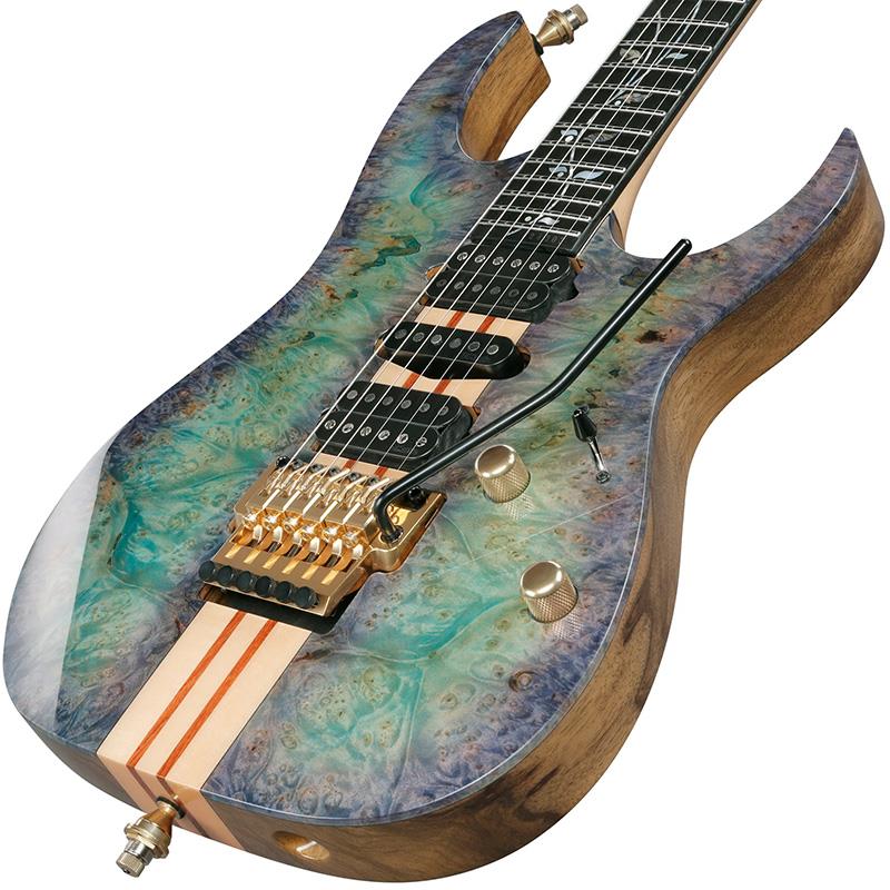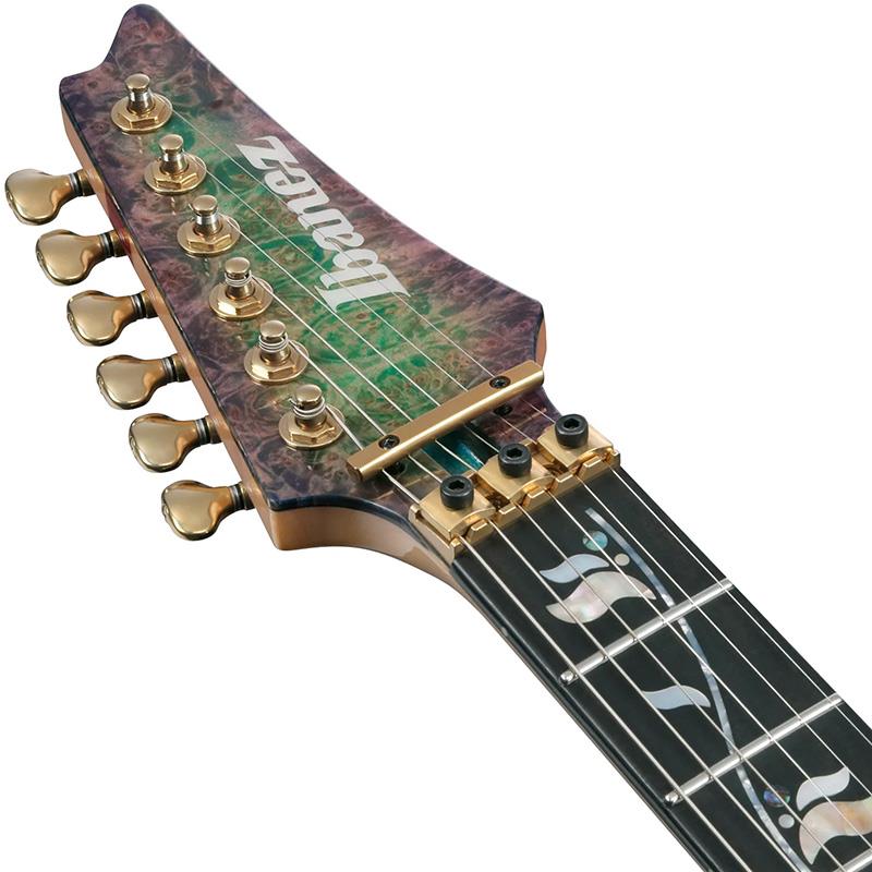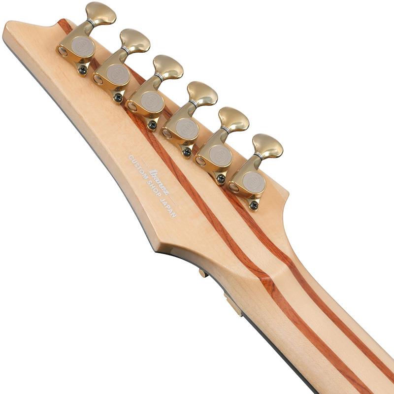 RGの王道とも言える木材仕様とパーツ構成、精度を追求したネックスルー構造を採用する一方、このIV2RGでは前衛的な配色のカスタム・フィニッシュで仕上げています。