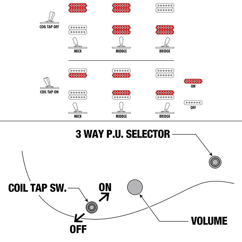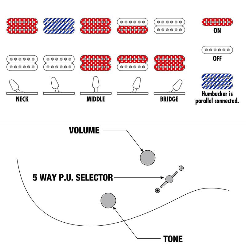 ◆HHピックアップ・レイアウトながら、フロント・パラレル配線や、 フロント・タップ+リア・タップ・サウンドも出せる、5WAYスイッチング・システム