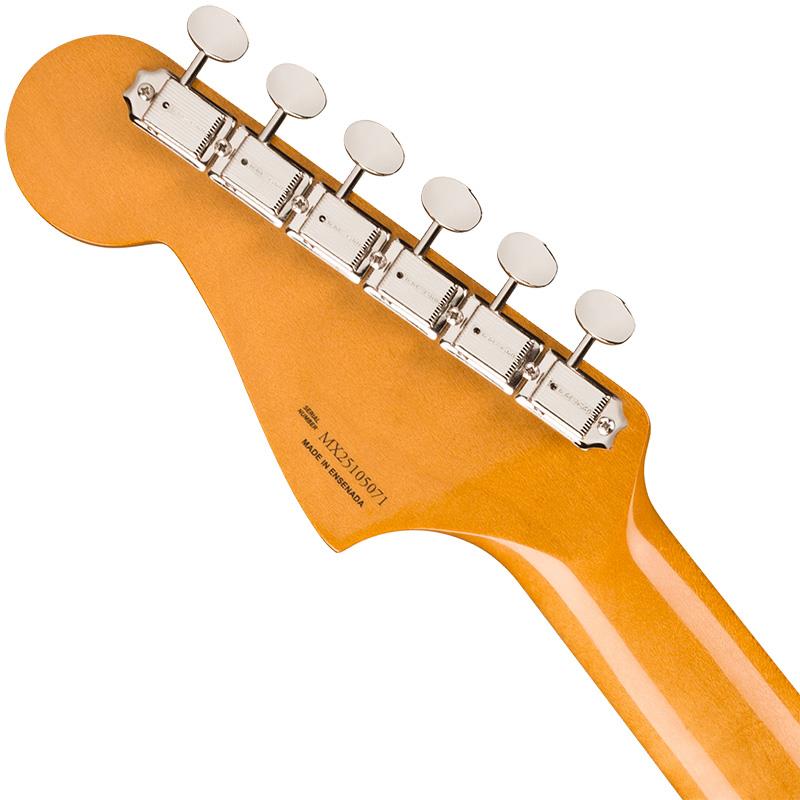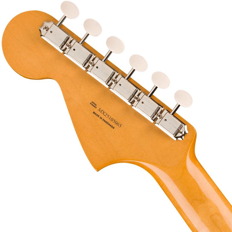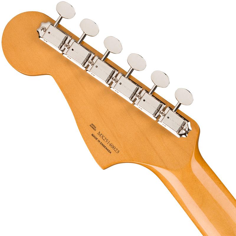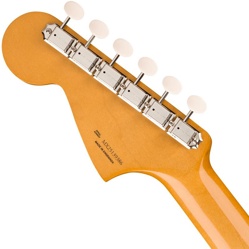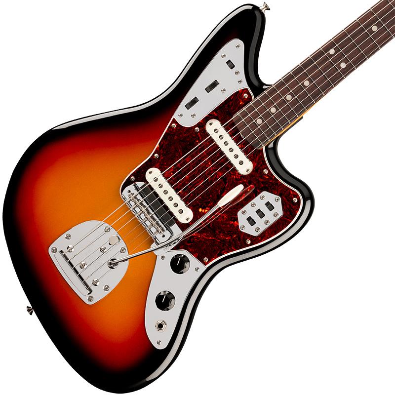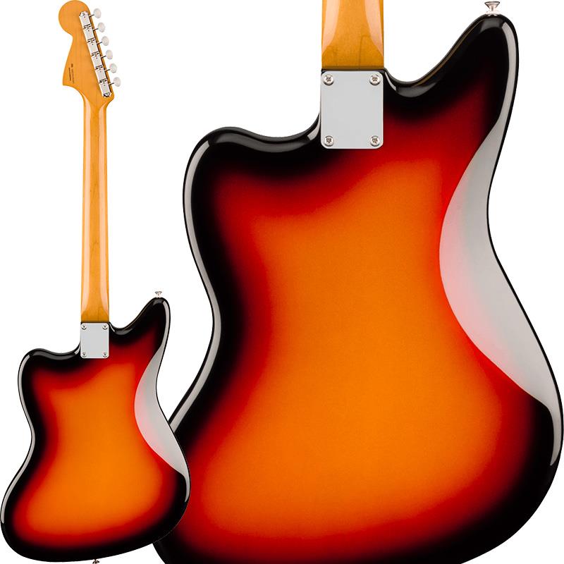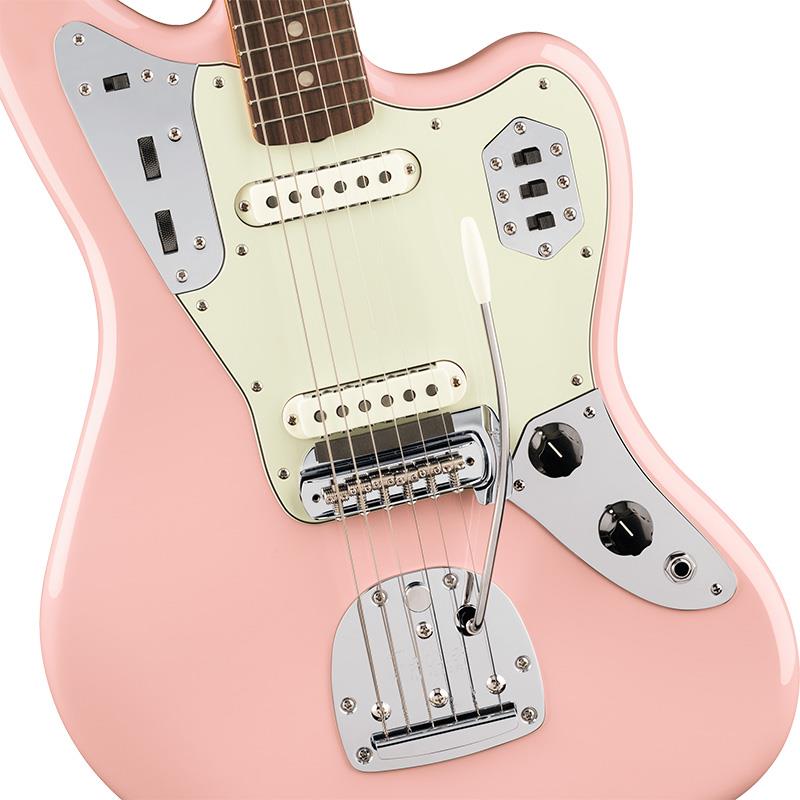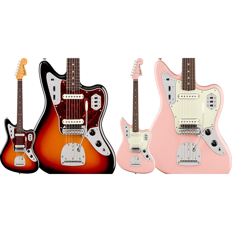 サウンドの要となるピックアップには、丁寧に作り込まれた60年代中期仕様のヴィンテージスタイルシングルコイルを2基搭載し、Fenderサウンドを確立した甘く煌めきのあるトーンを余すことなく表現します。その他、ヴィンテージスタイルのトレモロロック付きフローティングトレモロ、音作りの幅を広げる当時仕様のリズムサーキット、ヴィンテージスタイルのJaguarミュートといった特徴を備えています。ヴィンテージスタイルの様々なディテールがクラシックな美しさをエンハンスし、当時に忠実なチューニングマシンが高いチューニング精度を実現します。