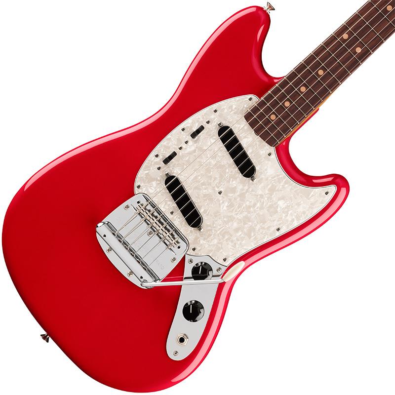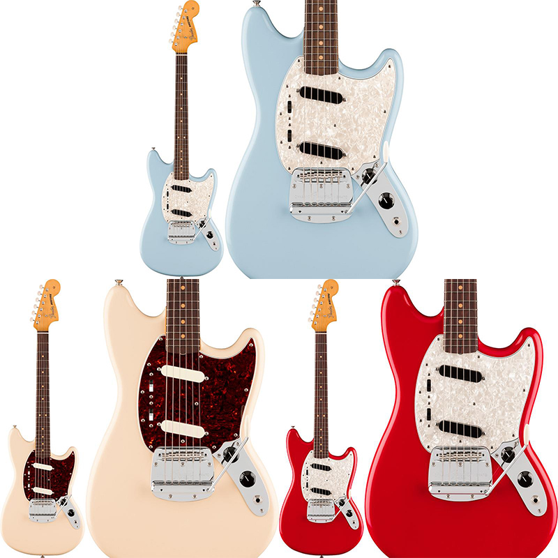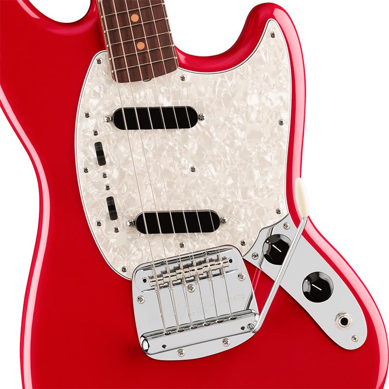 サウンドの要となるピックアップには、丁寧に作り込まれた60年代中期仕様のヴィンテージスタイルシングルコイルを2基搭載し、Fenderサウンドを確立した甘く煌めきのあるトーンそして温かくウッディなミッドレンジを余すことなく表現します。その他、ヴィンテージスタイルのMustangフローティングトレモロはスムーズなピッチ操作を可能にします。ヴィンテージスタイルの様々なディテールがクラシックな美しさをエンハンスし、当時に忠実なチューニングマシンが高いチューニング精度を実現します。