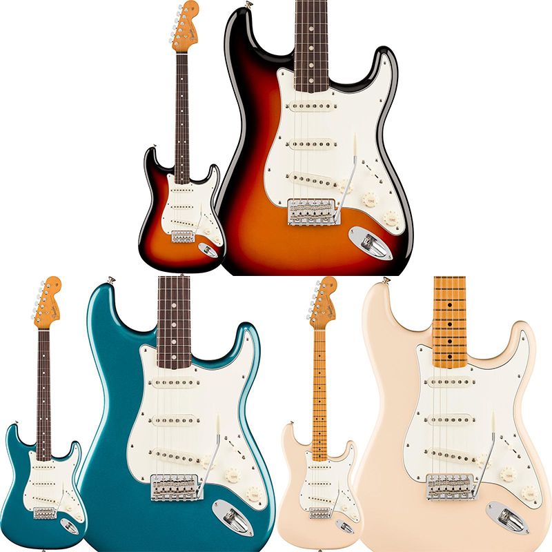 サウンドの要となるピックアップには、丁寧に作り込まれた60年代後期仕様のヴィンテージスタイルシングルコイルを3基搭載し、Fenderサウンドを確立したダイナミックで多彩なトーンを余すことなく表現します。ヴィンテージスタイルのシンクロナイズドトレモロは滑らかなヴィブラートを可能にし、年代仕様のヴィンテージスタイルチューニングマシンは、クラシックな外観を保ちながら優れたチューニング精度を実現します。