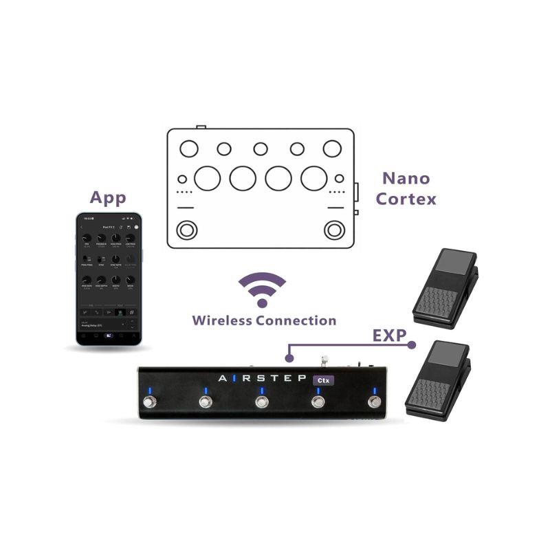 AIRSTEP Ctx を使えば、Nano Cortex を完全にハンズフリーでコントロールできます。64種類のプリセットすべてを瞬時に遅延なく切り替えられるほか、5つのエフェクトスロット、チューナー、タップテンポ、ドライブ、モジュレーションタイプもすべて足元からコントロールできます。